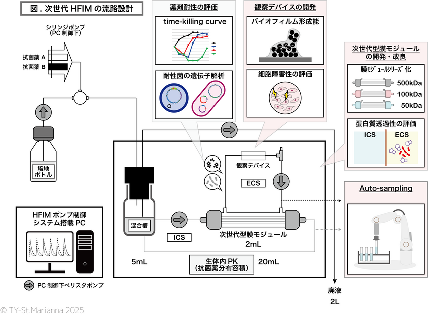 私たちの教室では、MRSA や CRE をはじめとする多剤耐性菌を対象に、実際の血中濃度推移に近い条件下で抗菌薬の殺菌効果・耐性抑制効果を評価し、単剤療法・併用療法を含む新規治療戦略の開発に取り組んでいます。HFIM を用いることで、in vivo に近い薬物動態環境下での治療効果を詳細に検討でき、臨床応用可能性の高いデータを創出しています。