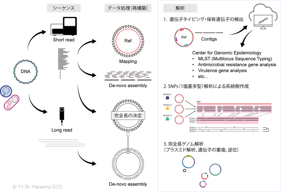 私たちの教室では、MRSA をはじめとする黄色ブドウ球菌、CRE やその他の薬剤耐性菌を対象に、全ゲノム解析(Whole-Genome Sequencing: WGS)を活用した病原性因子の同定、薬剤耐性遺伝子の解析、さらには分子疫学解析(MLST、耐性遺伝子解析、病原遺伝子解析など)を行っています。NGS データを用いることで、菌株間の関連性、アウトブレイクの推定、耐性獲得の分子過程を精密に解析し、感染症の本質的理解と臨床現場で役立つ知見の創出につなげています。