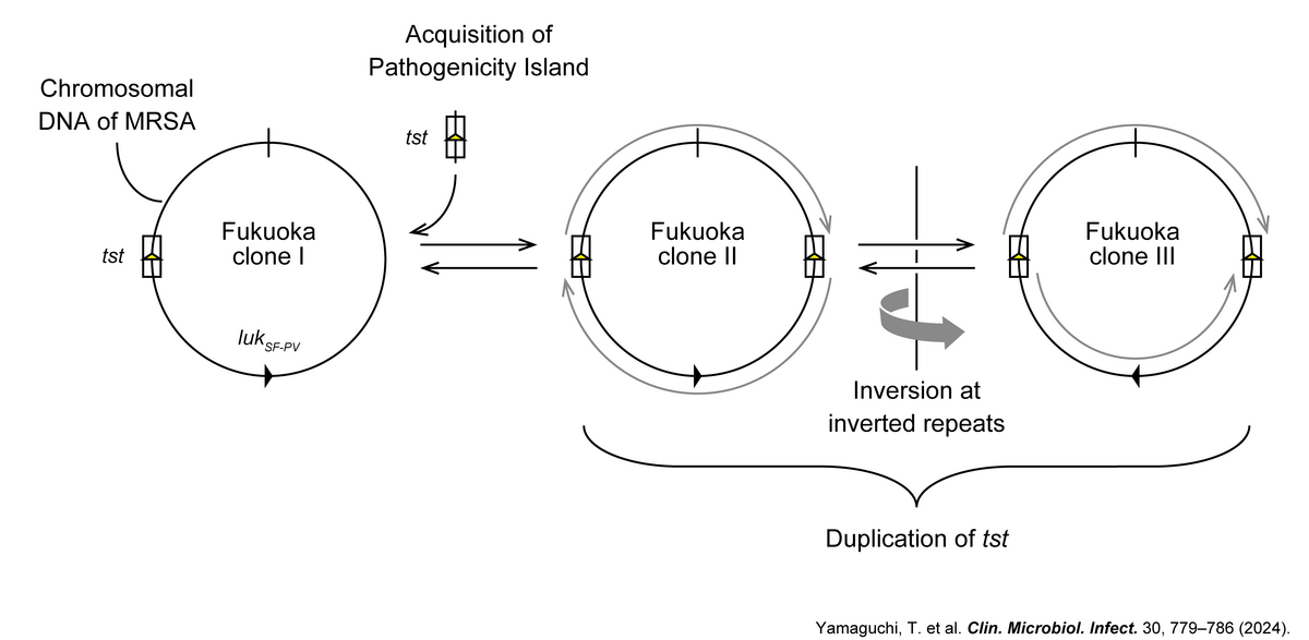 黄色ブドウ球菌の進化は、病原遺伝子や耐性遺伝子の獲得に加えて、遺伝子重複やゲノム逆位などの構造変化、さらには点突然変異の蓄積によって多様化し、薬剤耐性や病原性の獲得に影響を与えてきました。